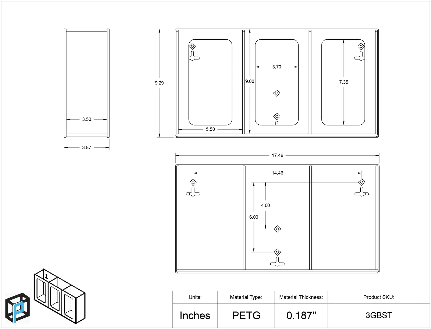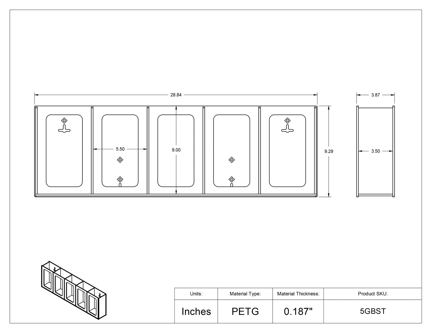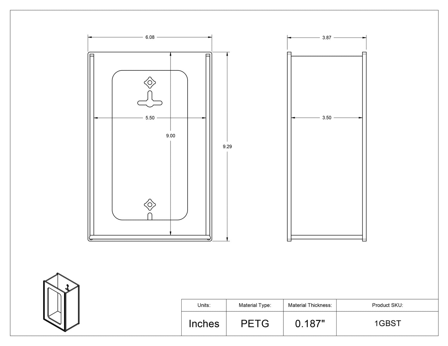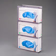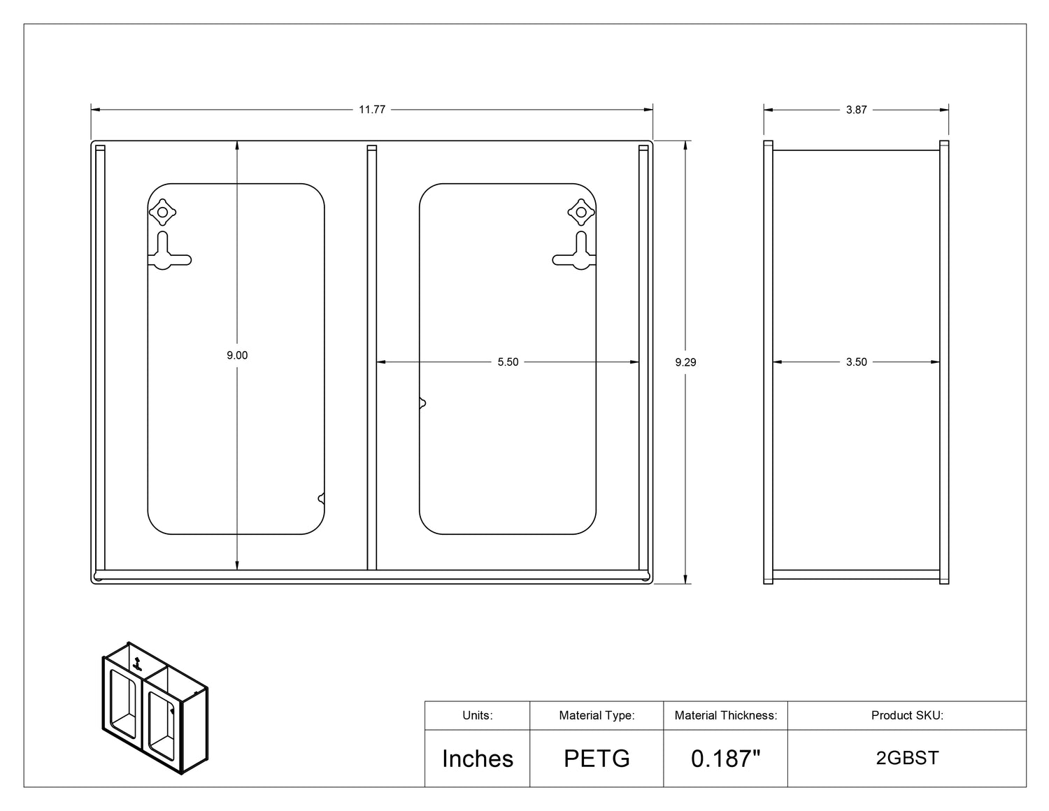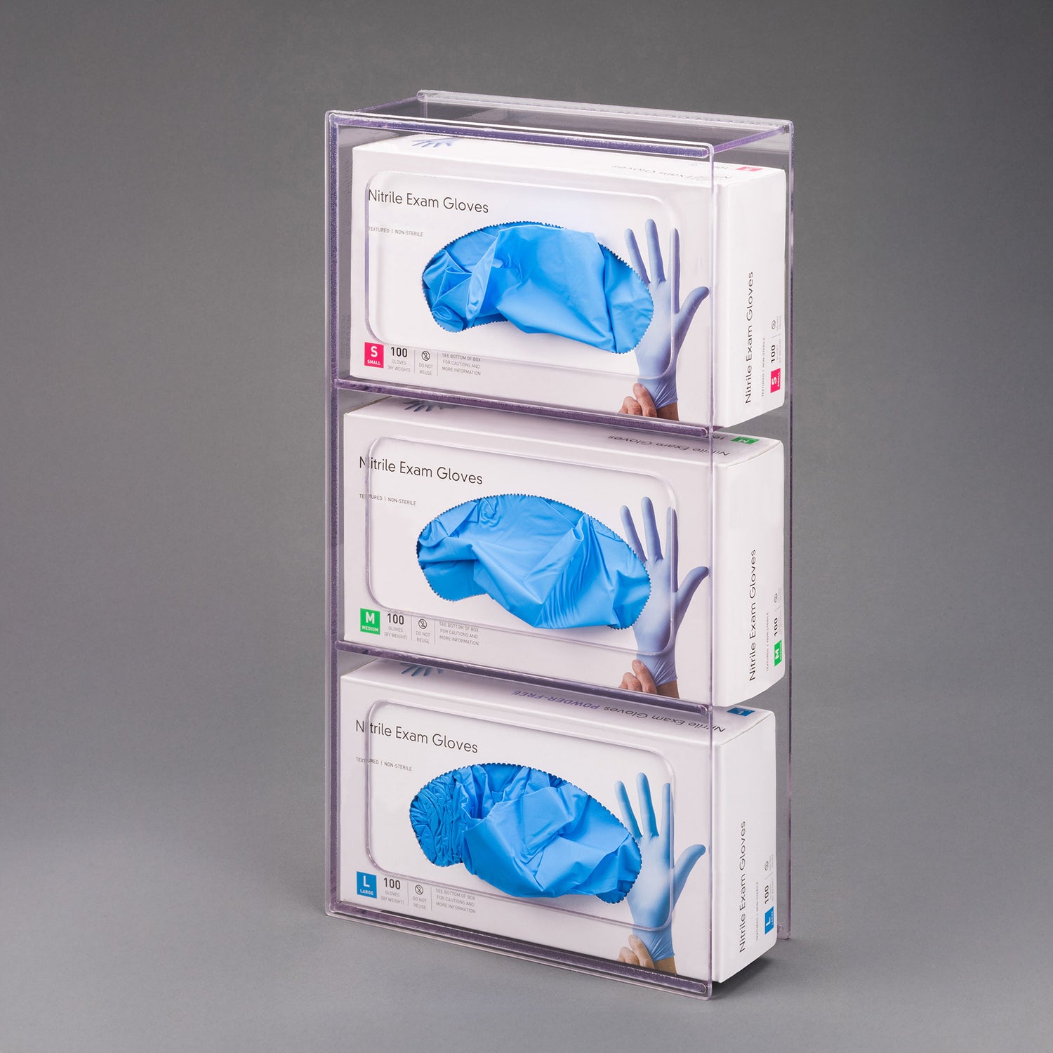Glove Box holder. Fits most standard glove box sizes. Choose from 1, 2, 3, 4, or 5 box capacity. Choose from Wall Mount (screws/anchors included) or Magnet Mount (powerful magnets included). Durable and cleanable PETG construction. SEE IMAGE FOR DIMENSIONS. Consumables not included. Made in the USA.
