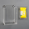 The Poltex DECO line features durable 1/4in thick acrylic construction, shiny, flame-polished edges, and stainless steel caps for mounting for a decorative look. Holds a bag of disinfecting wipes. Includes all mounting hardware (screws, anchors, stainless steel caps). SEE IMAGE FOR DIMENSIONS.