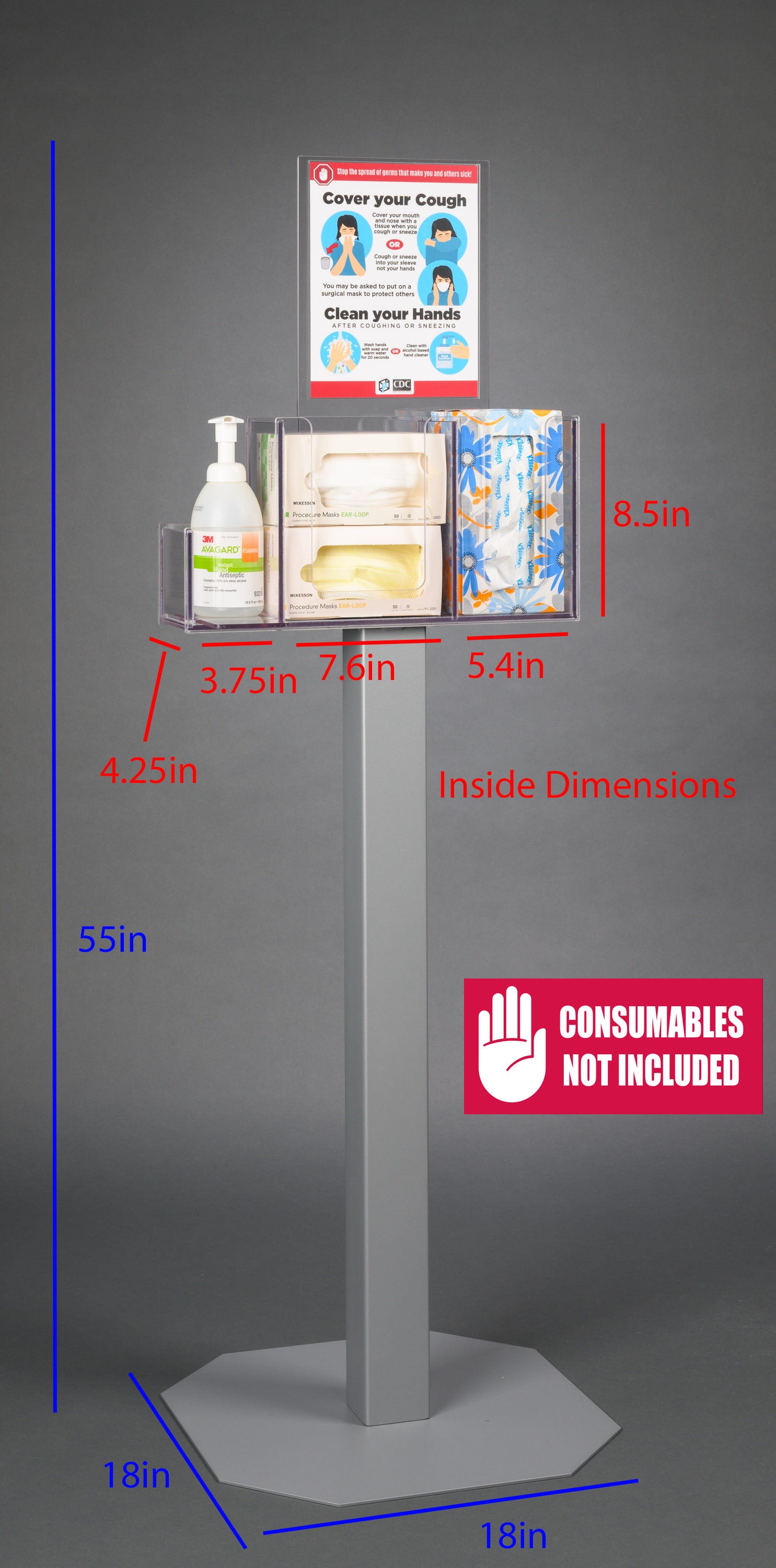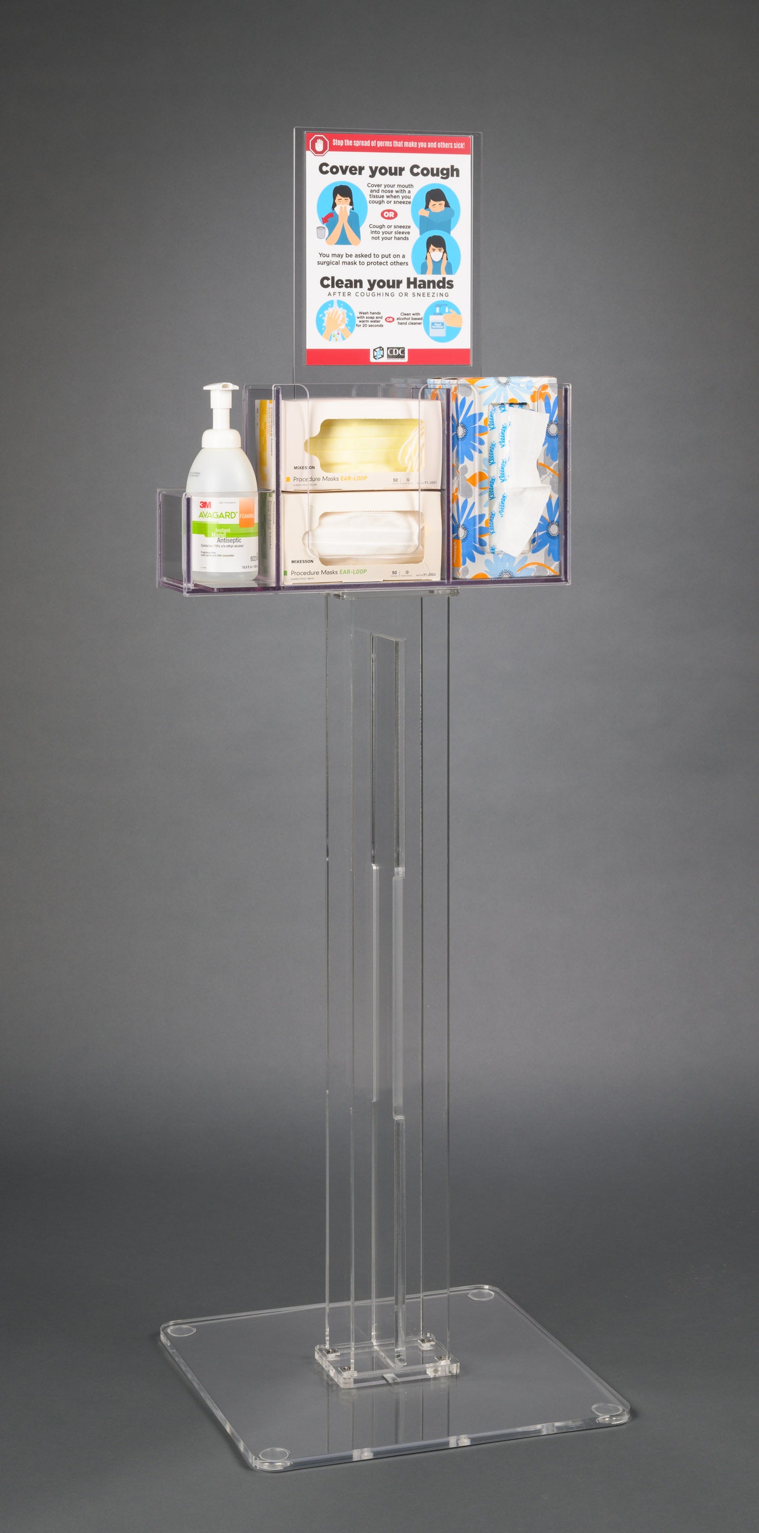 Our American made, Locking Respiratory Hygiene Station I holds infection prevention items to help keep your workplace safe. Durable PETG station is mounted to an attractive, heavy duty acrylic stand.