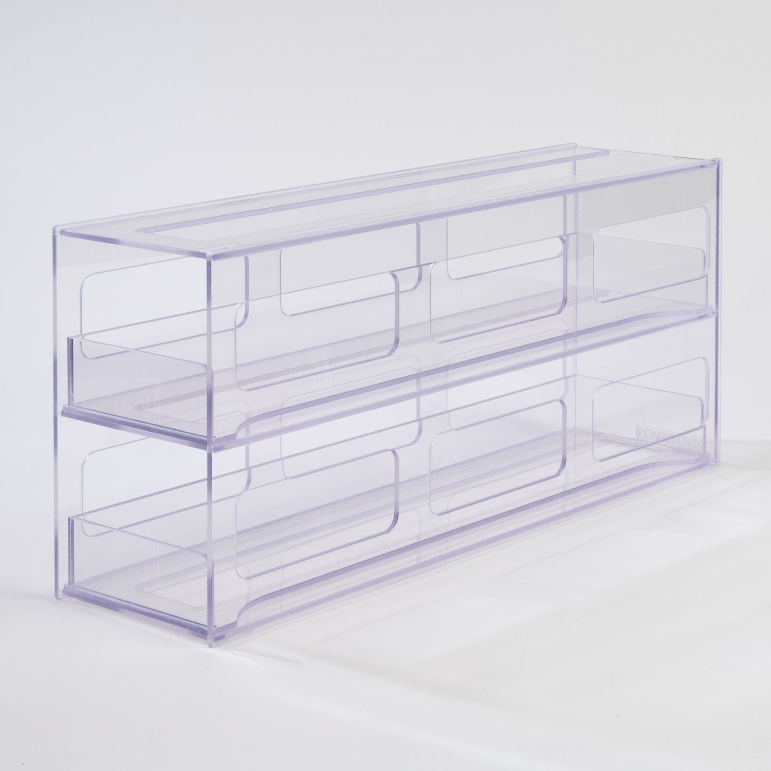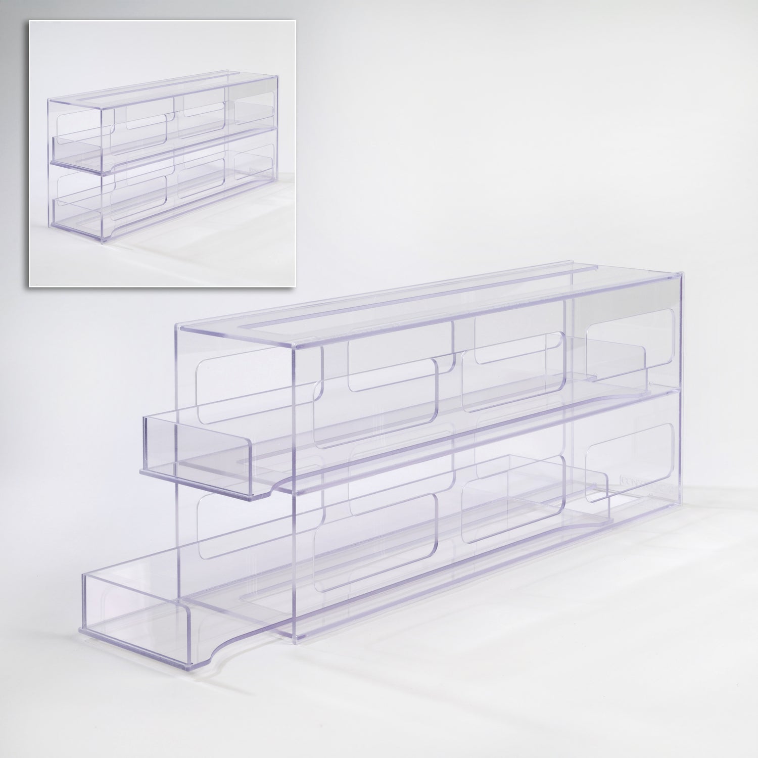 Freezer/fridge rack. Two slide-out shelves fit 4 boxes each for a total of 8 boxes. Fit 150 x 150 x 124mm boxes for 50ml conical tubes, Globe Scientific or equivalent. Durable PETG construction is suitable to -80C. Durable and cleanable PETG construction. SEE IMAGE FOR DIMENSIONS. Consumables not included. Made in the USA.